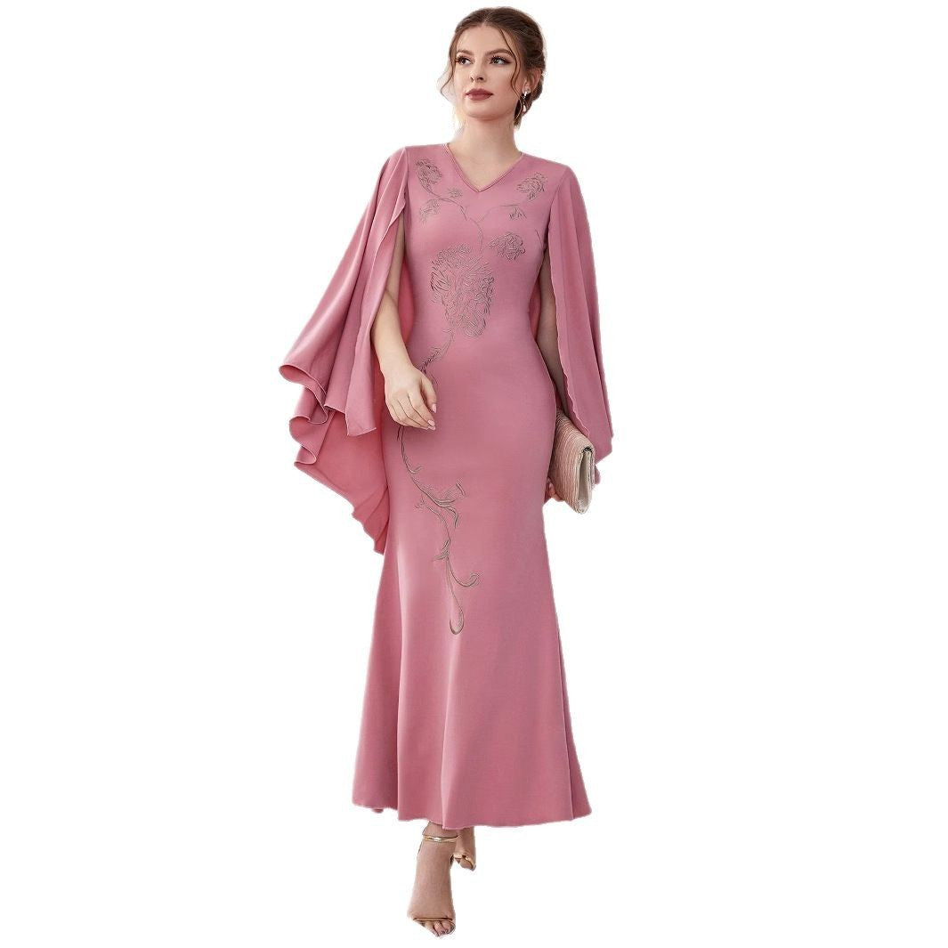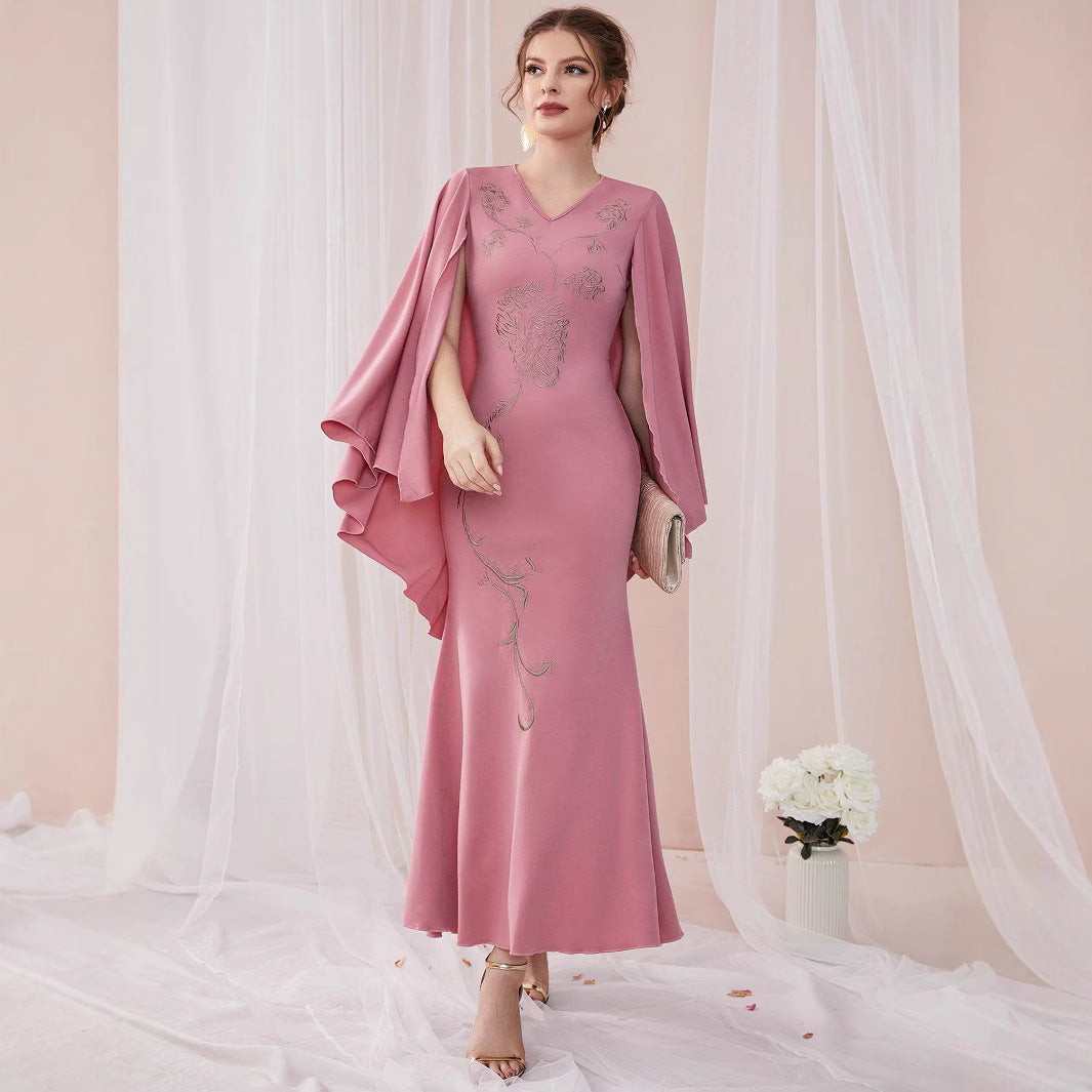 Embroidered Slim Bat Sleeve Sheath Dress